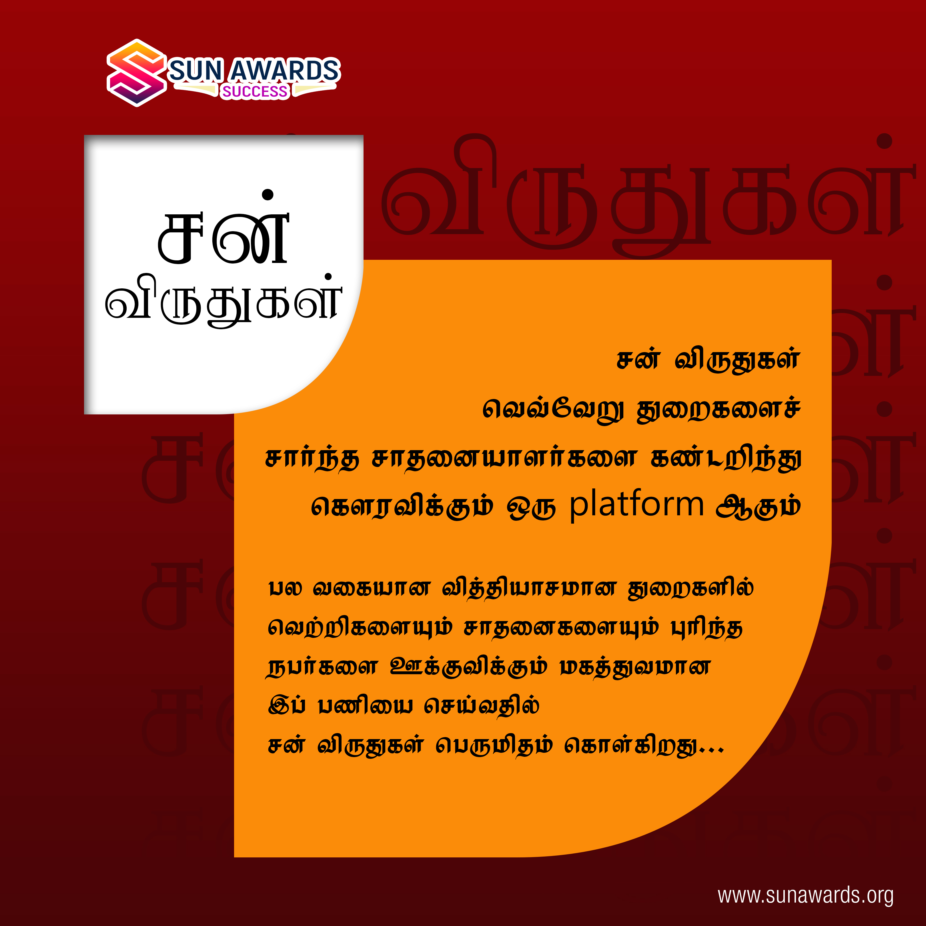 சன் விருதுகள் வழங்கப்படும் வெற்றி விருதுகள் உங்கள் துறையில் அல்லது தொழில்துறையில் உங்கள் நற்பெயரையும் நம்பகத்தன்மையையும் அதிகரிக்கும்.