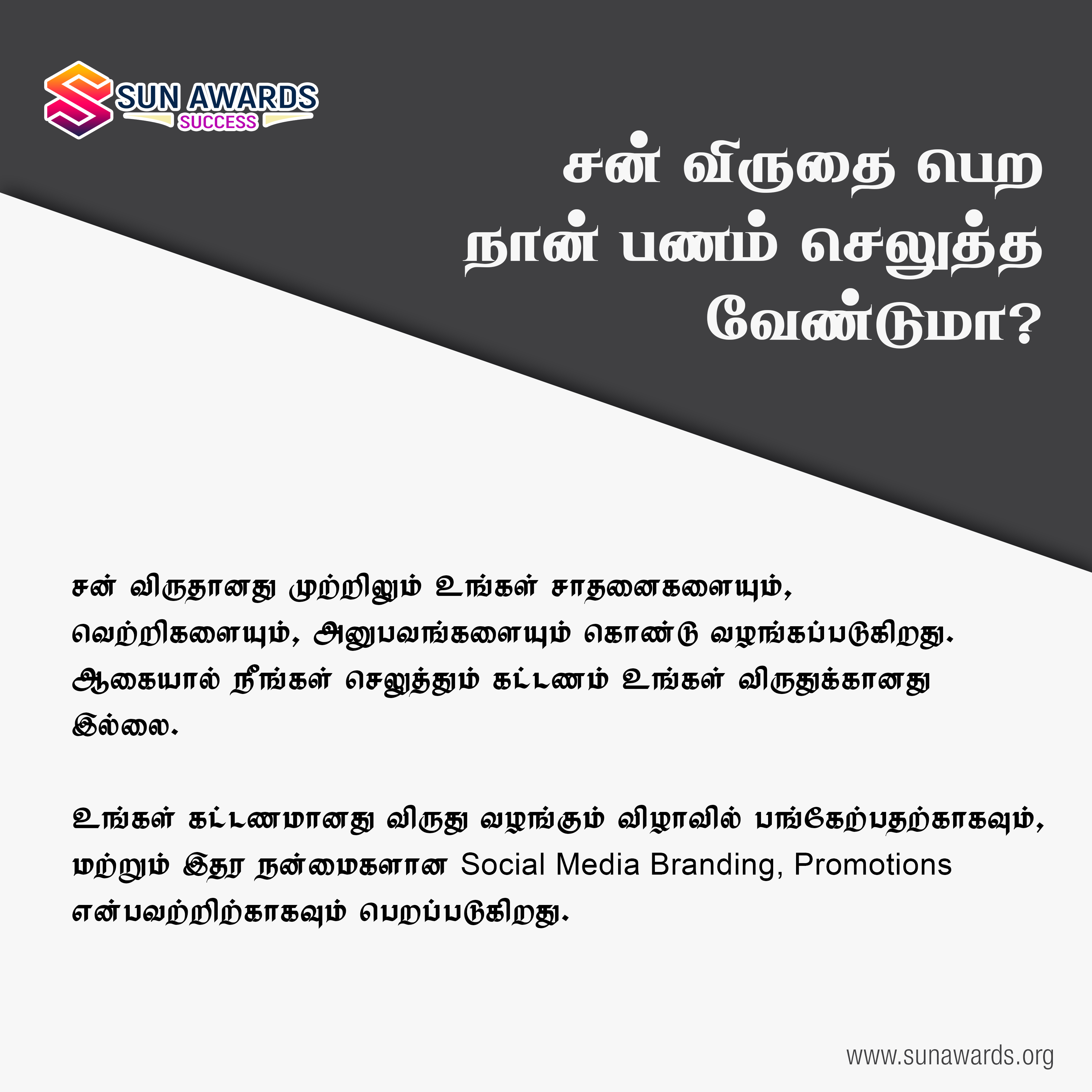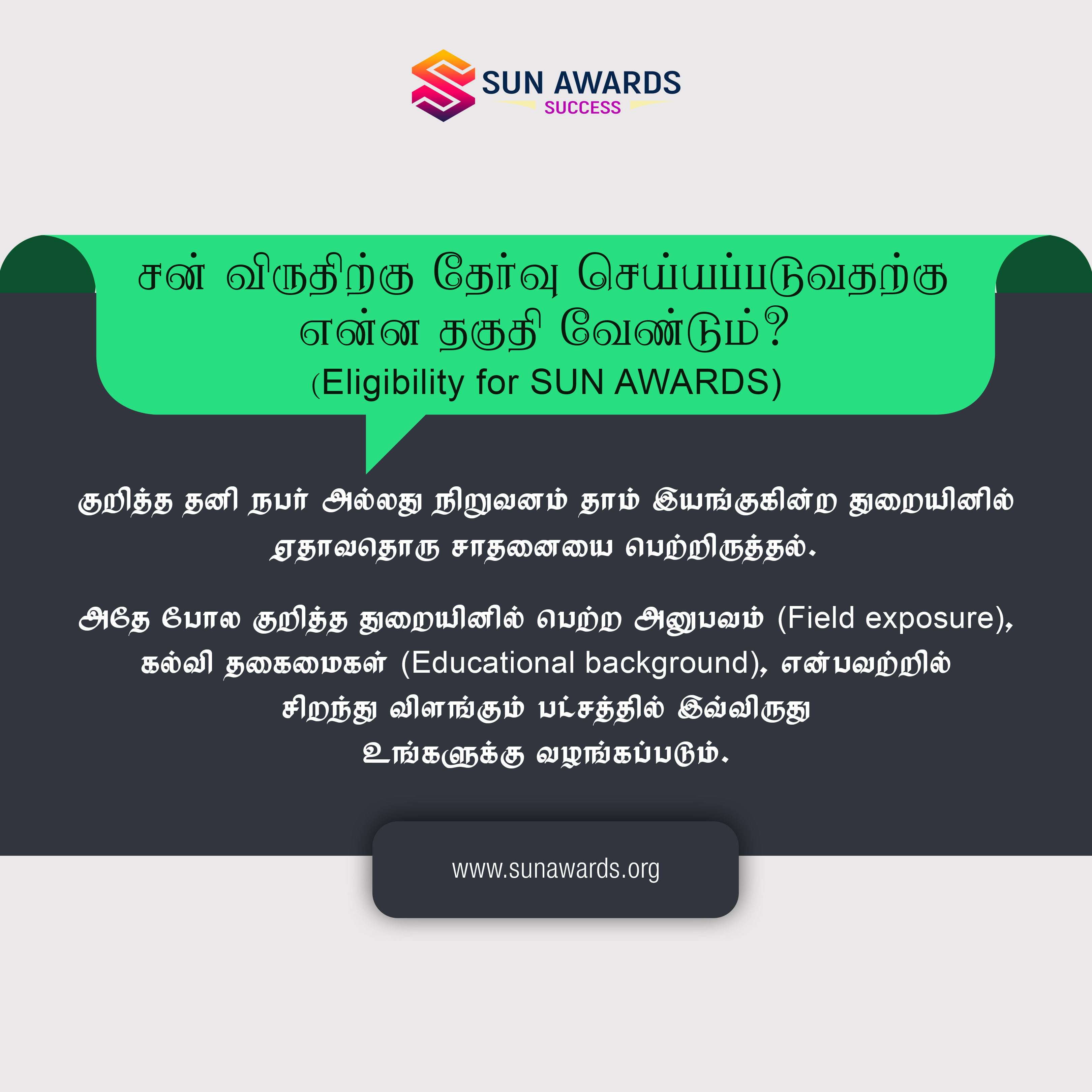 பல வகையான வித்தியாசமான துறைகளில் வெற்றிகளையும் சாதனைகளையும் புரிந்த நபர்களை ஊக்குவிக்கும் மகத்துவமான இப் பணியை செய்வதில் சன் விருது பெருமிதம் கொள்கிறது.
