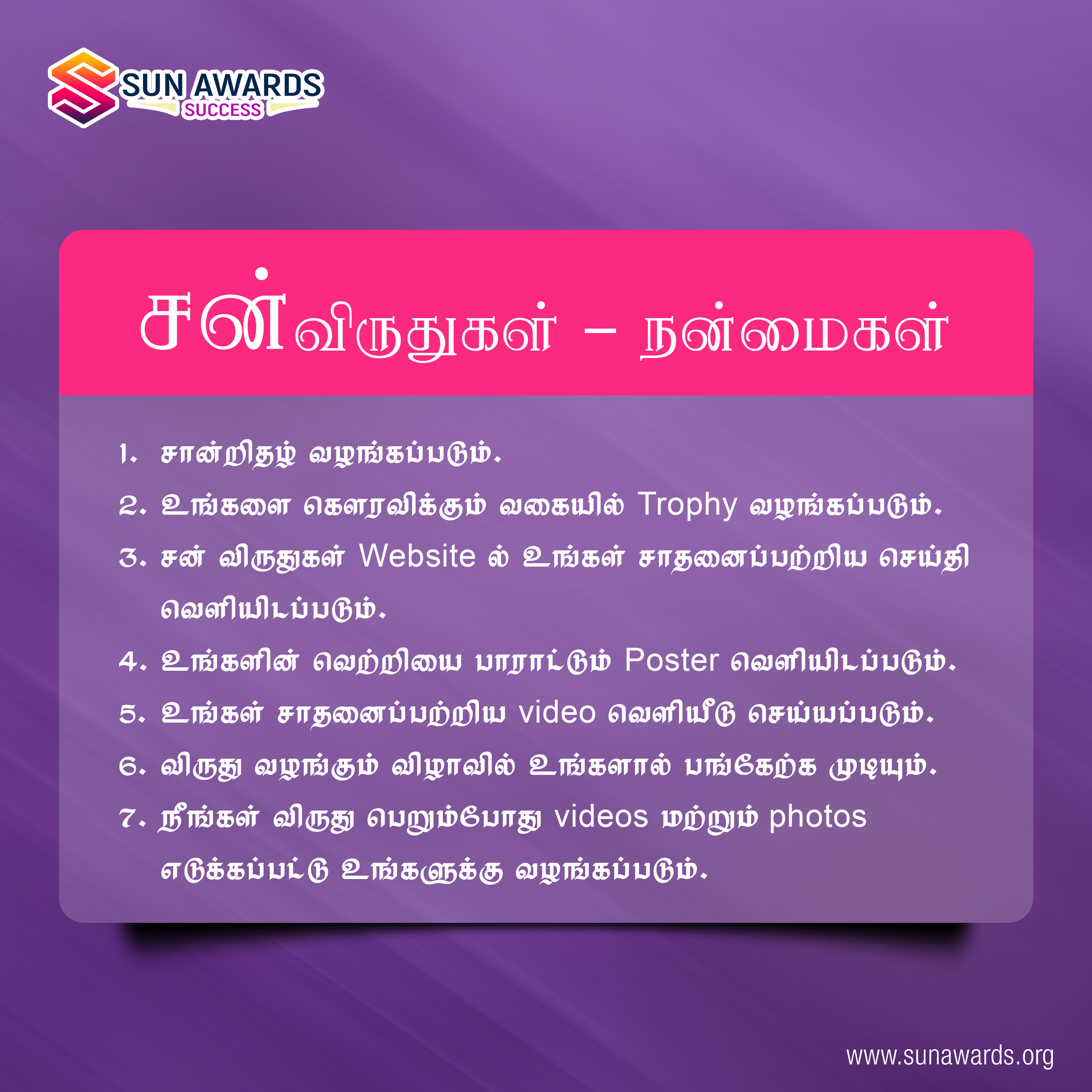 - சன் விருது Website ல் உங்களின் சாதனைப்பற்றிய News வெளியிடப்படும்.