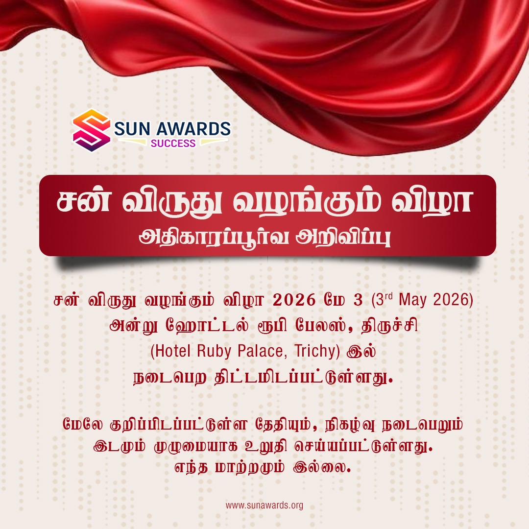 சன் விருது வழங்கும் விழா 2026 மே 3 (May 3rd, 2026) அன்று Hotel Ruby Palace, Trichy இல் நடைபெற திட்டமிடப்பட்டுள்ளது.